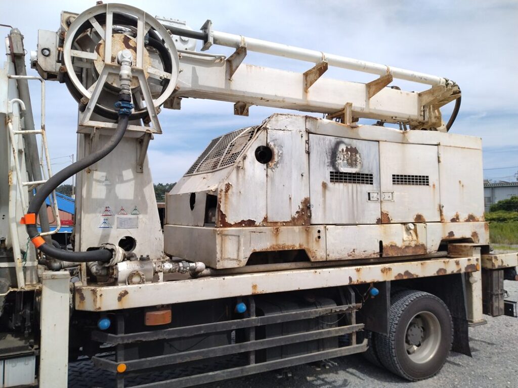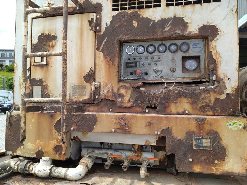 穴掘建柱車のコンプレッサー部分全体的に錆で腐食が進んでいます。