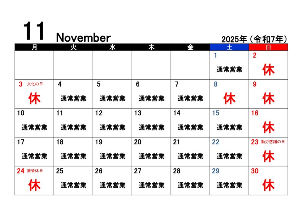 11月度の営業日のお知らせです。