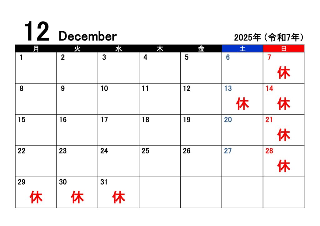 12月度の営業カレンダーです。